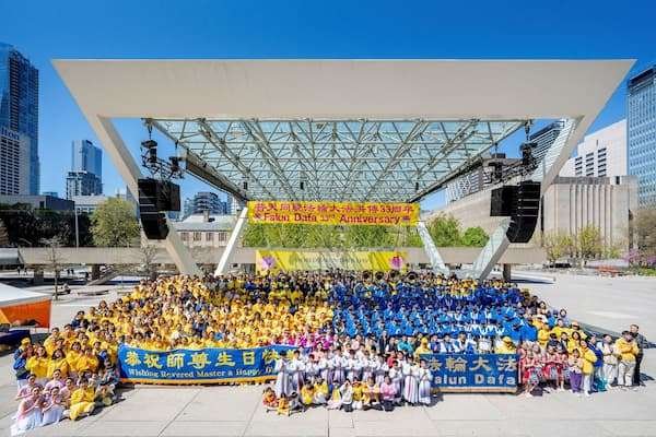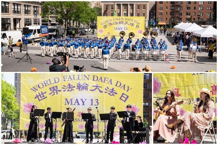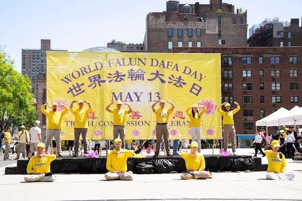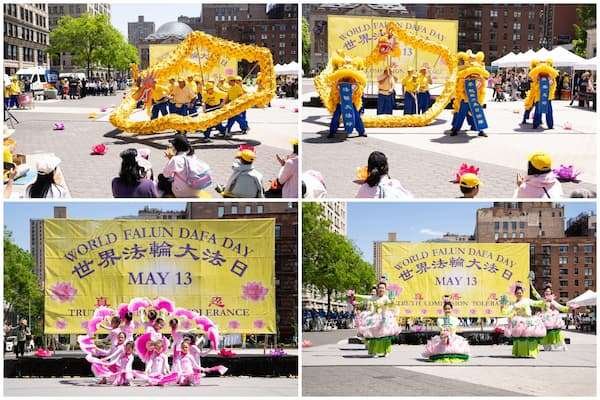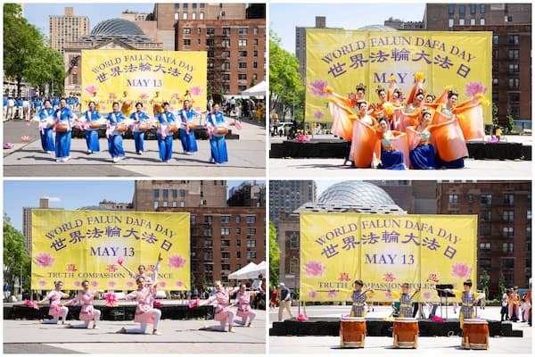 二零二五年五月十一日(周日),纽约曼哈顿的地标之一——联合广场上欢声笑语,美丽的金黄色大型画布上写着中英文“世界法轮大法日”,画布前的舞台上法轮功学员盛装而舞,恭祝慈悲伟大的师尊华诞快乐,喜迎第二十六届世界法轮大法日——二零二五年五月十三日,及法轮大法弘传世界三十三周年。